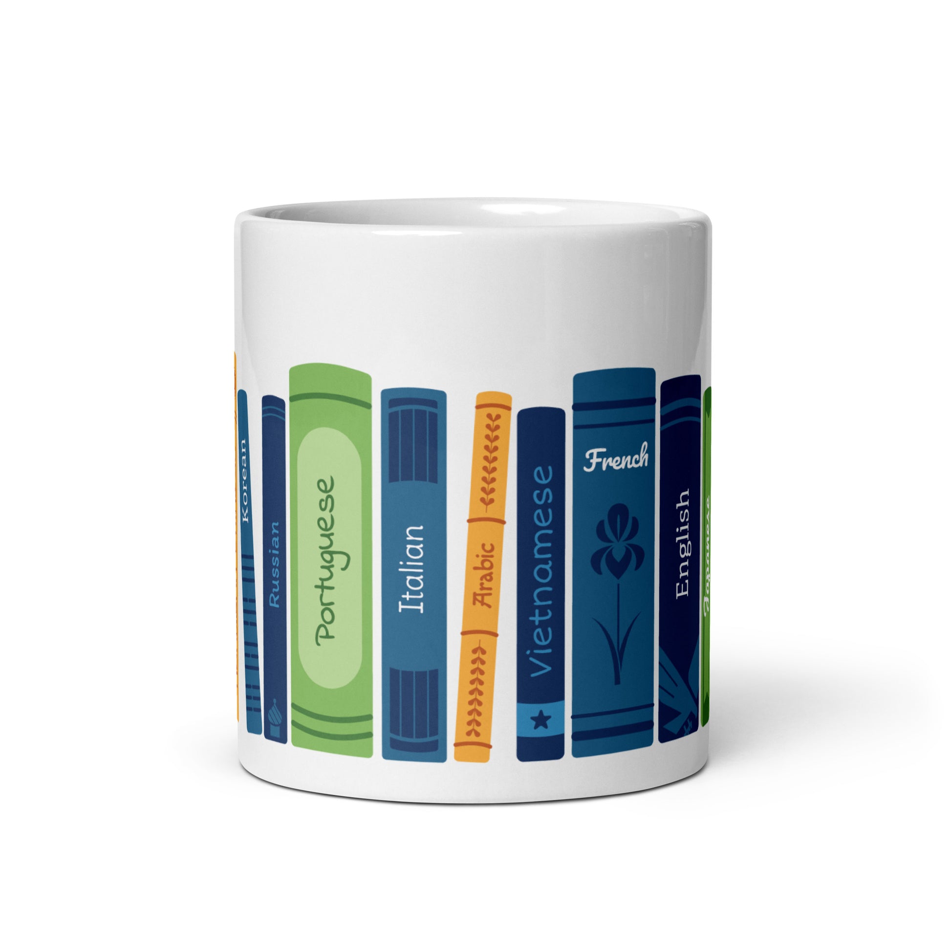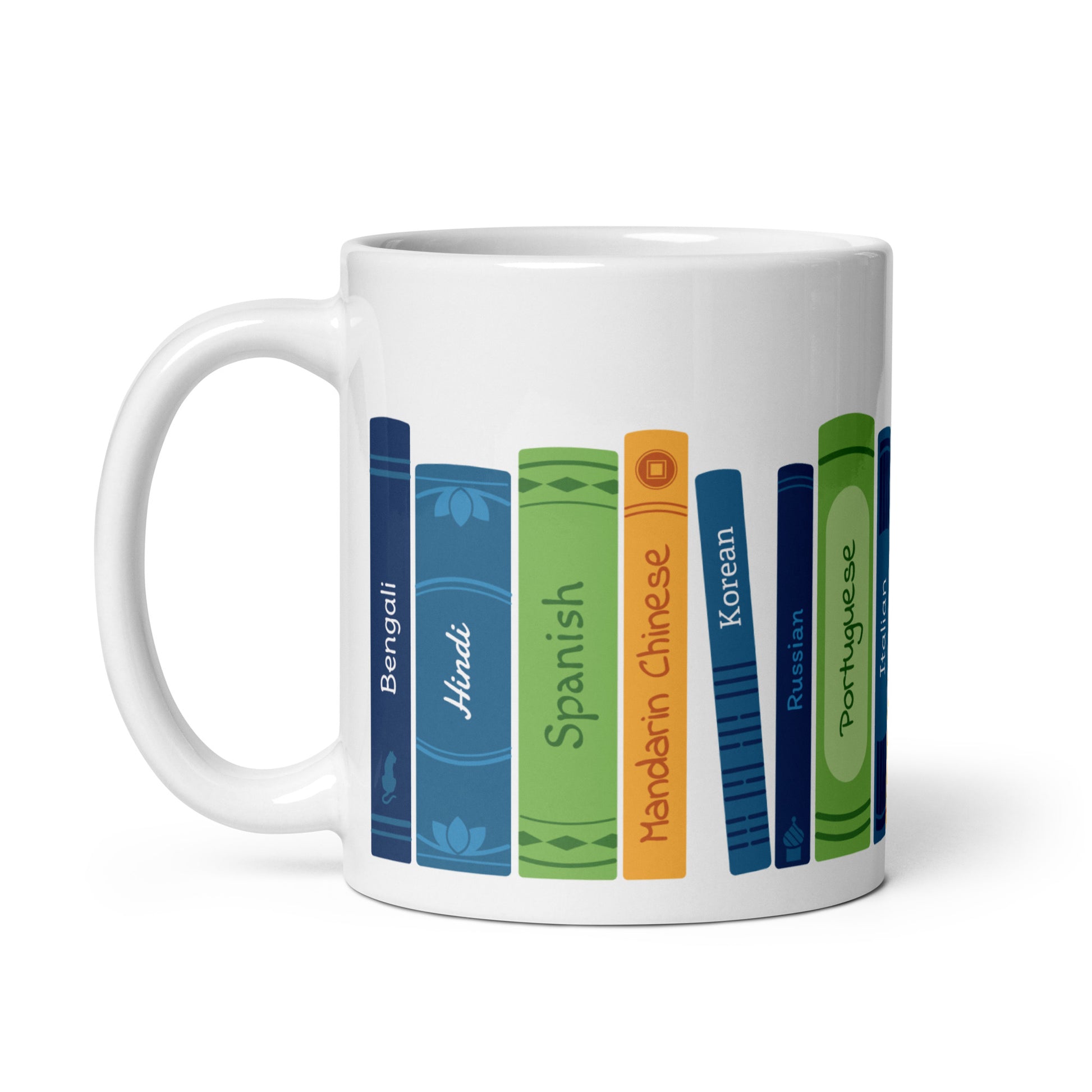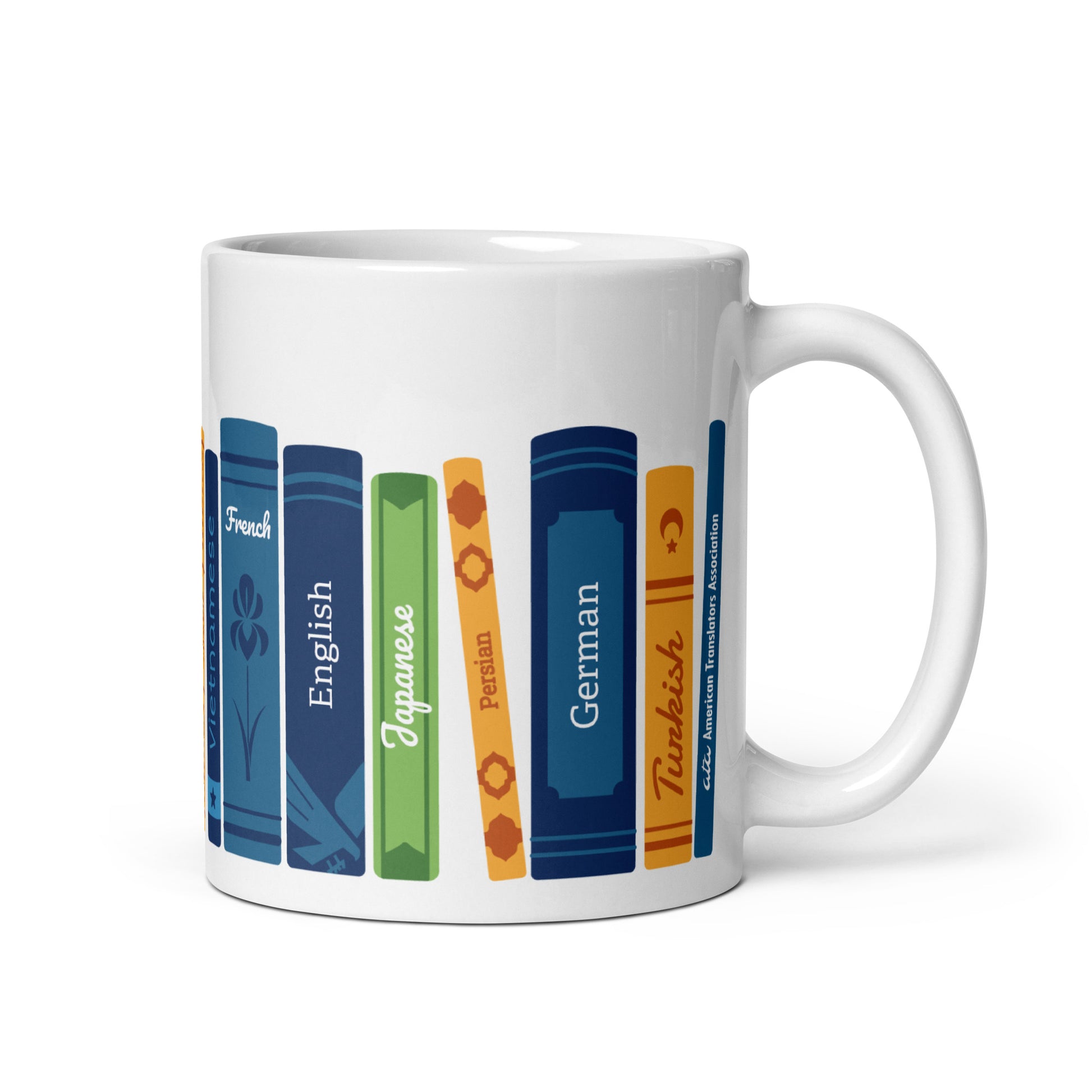 Start your morning with an invigorating caffeinated beverage with this coffee mug with the American Translators Association (ATA) logo. The custom illustration features books with a variety of languages written on their spines to creatively show ATA’s passion for language.