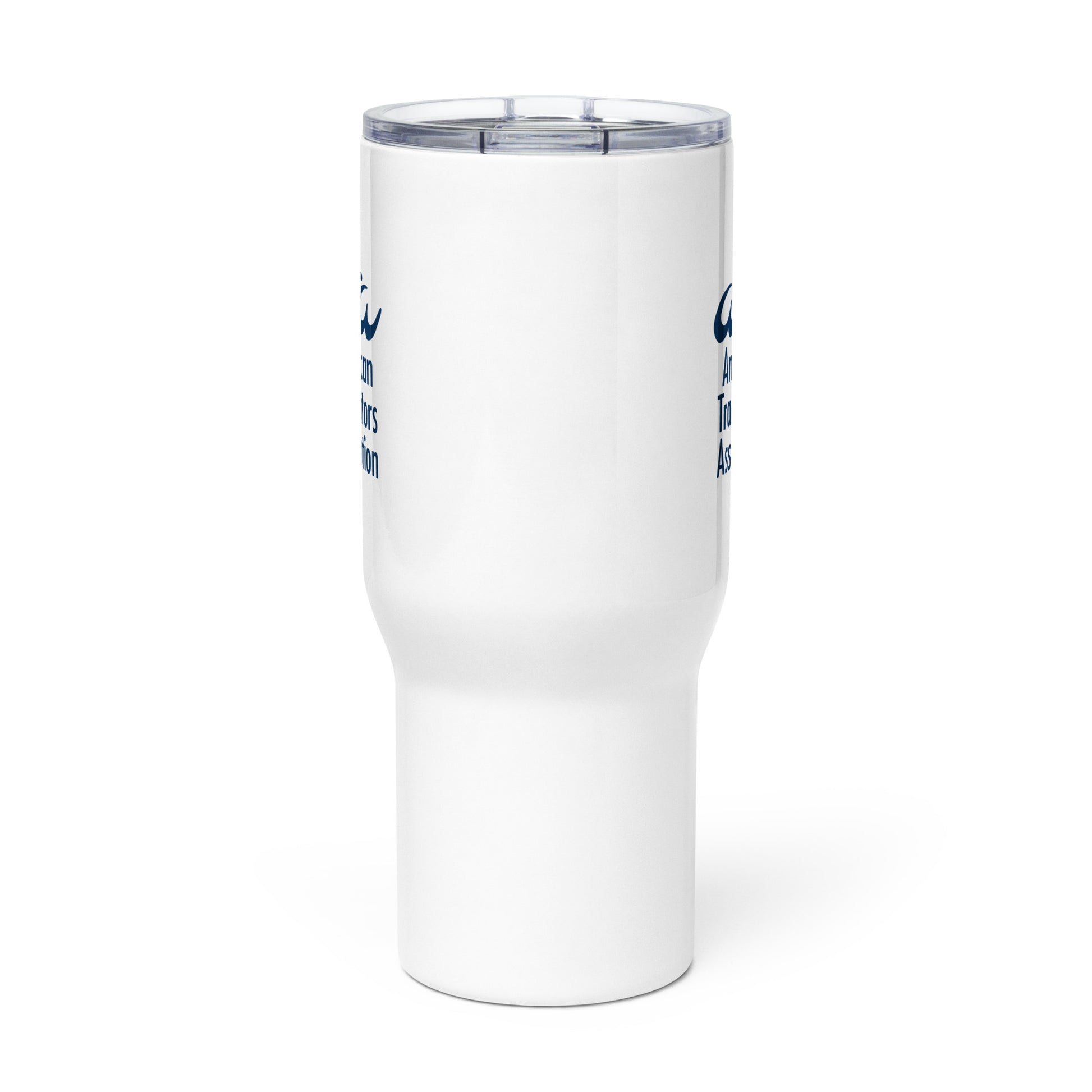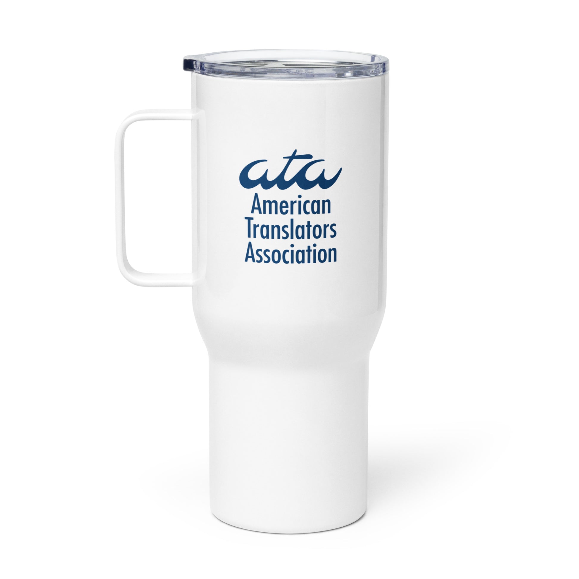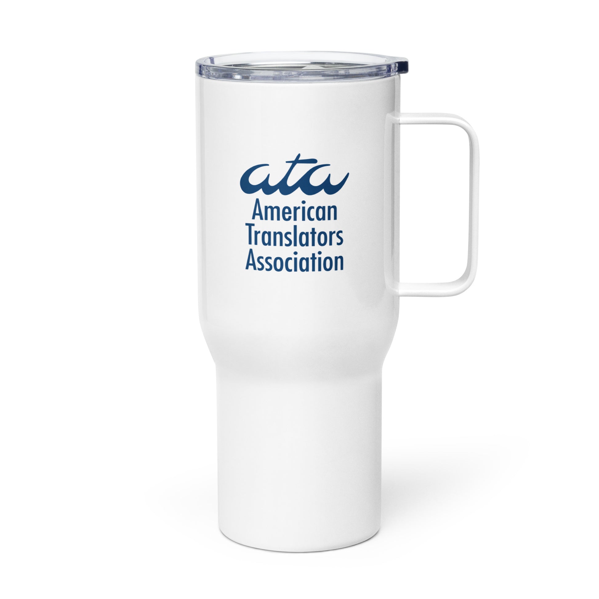 Stainless Steel Travel Mug with American Translators Association Logo and Handle